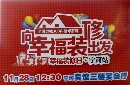 2015年11月28日,寧河歐斯龍向幸福裝修出發,全城尋找300戶裝修家庭,前所未有,大幅讓利,讓您真正體驗廠家直銷的好處。十一大家居建材品牌在寧河賓館等著您的到來,產品物美價廉,放心省心購物,七大驚喜,金條、洗衣機、電壓力鍋、電飯鍋等大獎送不停!