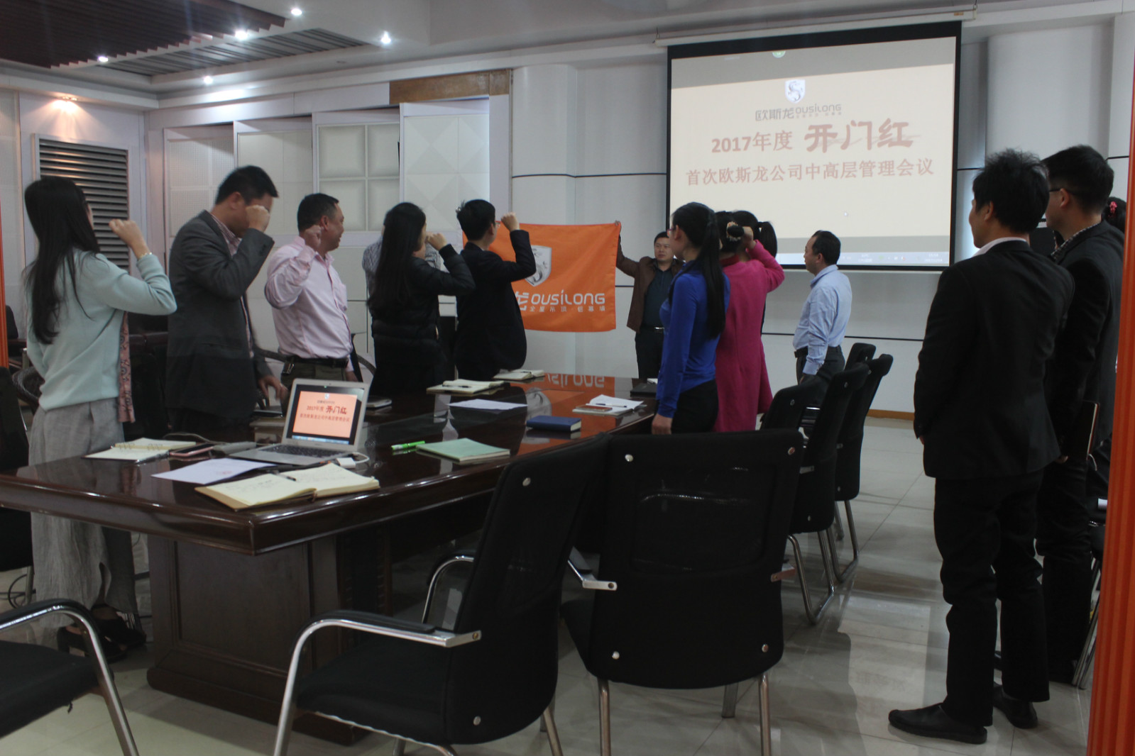會議中,歐斯龍董事長梁總還宣布了2017年?duì)I銷管理中心的任務(wù)目標(biāo)以及要求。產(chǎn)品更新、營銷創(chuàng)新、人員管理革新等等一項(xiàng)一項(xiàng)的重大變革要求目的只有一個------務(wù)必讓市場和廣大消費(fèi)者眼前一亮。宣布落實(shí)營銷管理中心各部門每天、每月、每季的任務(wù)要求以及獎勵。大大的鼓舞了在場參加會議的每一位。為表決心,會后全體人員均緊握右拳向著歐斯龍公司旗幟進(jìn)行了莊嚴(yán)的宣誓儀式。時代的變遷,競爭的浪潮此起彼伏,穩(wěn)中求變方為企業(yè)立身之道,新年之際,我們歐斯龍人一個個戰(zhàn)意昂揚(yáng),雄心在這個新的開始楊帆啟程。