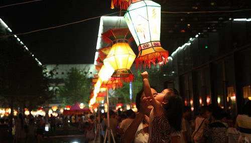 2、燃燈:中秋夜燈內燃燭用繩系于竹竿上,高豎于瓦檐或露臺上,或用小燈砌成字形或種種形狀,掛于家屋高處,俗稱‘樹中秋’或‘豎中秋’。富貴之家所懸之燈,高可數丈,家人聚于燈下歡飲為樂,平常百姓則豎一旗桿,燈籠兩個,也自取其樂。滿城燈火不啻琉璃世界。”看來從古至今中秋燃燈之俗其規模似乎僅次于元宵燈節。