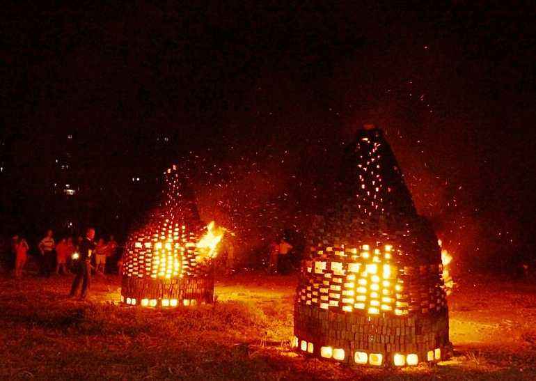 5、燒塔:南方廣泛流傳著燒瓦子燈(或稱燒花塔、燒瓦塔、燒番塔)的游戲。如《中華全國風俗志》卷五記:江西“中秋夜,一般孩子于野外拾瓦片,堆成一圓塔形,有多孔。黃昏時于明月下置木柴塔中燒之。俟瓦片燒紅,再潑以煤油,火上加油,霎時四野火紅,照耀如晝。
