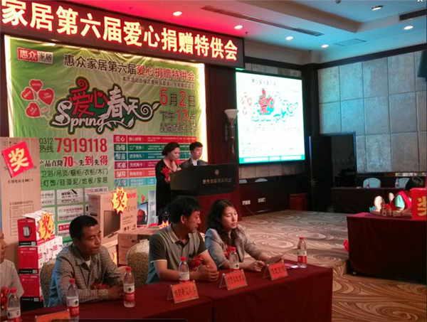 2014年5月2日,一場以惠眾家居聯盟愛心捐助為主題的特供會在保定上映。歐斯龍集成吊頂攜手各大家居商家為廣大業主提供最具性價比的家居建材,同時,各商家聯手弘揚社會美德,為保定教育事業貢獻力量。