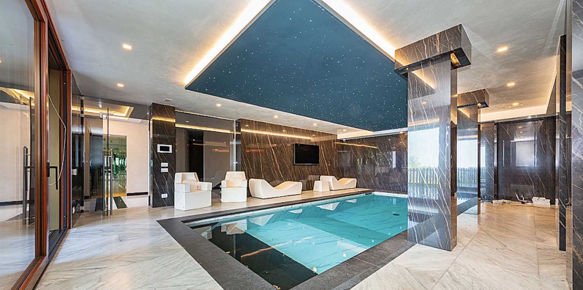 別墅主體總共分四層~底層是水療中心,有桑拿、土耳其浴和室內(nèi)游泳池,還有一個(gè)帶客人浴室的房間。