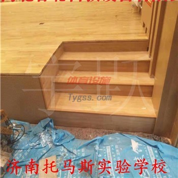 濟南托馬斯實驗學校音樂廳舞臺采用舞臺專用柞木地板,單龍骨安裝堅固又耐用,淺黃顏色,高端更上檔次。