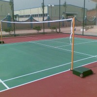 (10)劃線:按標準尺寸量度定位,用帆布線標出線條位置,然后而用美紋紙沿帆布線貼在球場上,用劃線專用劃線漆均勻用毛刷刷于兩美紋紙之間,待涂料表面干后把美紋紙撕掉即可。