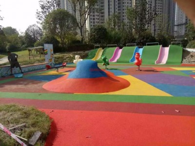 采用原色橡膠顆粒,顏色鮮艷,色彩豐富可組成各種卡通圖案,不易褪色。其透心特質,即表面磨損仍光滑如新。因整體鋪設,故不存在裂縫問題。其下面吸震層可根據地面狀況作適當調整,使其表面平整。 ◆維修和保養: 2、夏季炎熱天氣要噴灑涼水,以降低其表面溫度。 ◆適用場地: